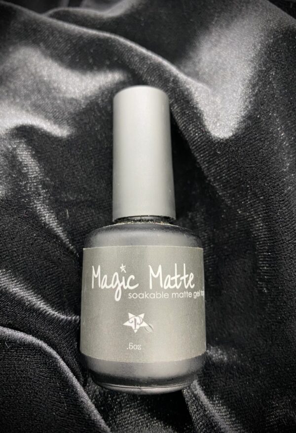 Magic Matte soakable matte gel top. UV cure 2 min, LED cure 30 sec. Use alcohol to wipe inhibition layer for best matte results.